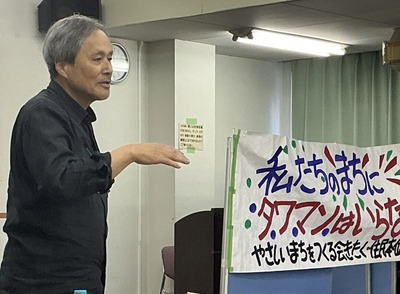 5月はドイツ・バイエルン州建築家協会の水島信(まこと)さん。「住みづらいところを住みやすくするのがまちづくり」「他人の日照・採光・風通しを犠牲にした高層建築は自分の権利しか主張していない。日本の建築は弱肉強食状態」「ドイツは建ぺい率0・6、容積率120%と、自力で登って降りられる高さが基準。新たな開発・建設には議会の承認、住民公聴会での賛同が必要だ。多数決は犯罪」と話し、住民主体のまちづくり図の作成を推奨した。