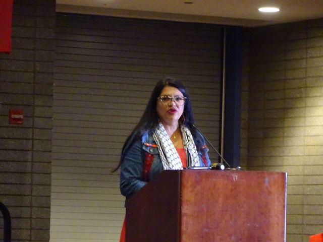 大会を象徴し、内容を決定づけたのは、DSA所属で両親がパレスチナからの移民労働者であるラシダ・タリーブ連邦議会下院議員だ。彼女は「アメリカの変革は常に私たち自身から生まれる」と題した大会基調報告演説を行った。