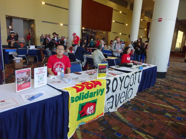 タリーブ議員と海外ゲストとの対面の場では、連帯のあいさつをかわし、握手。宣伝・販売コーナーも設けられ、DSA国際委員会の机には、2025ZENKOで小芝ひでとし大阪狭山市議からアンリン・ワンさんに手渡された全交南大阪の連帯バナーが飾られていた。プログレッシブ・インターナショナルやBDS運動メンバーと会い、「日本のファナックのイスラエル加担をどう止めましょうか?」と話しかけられることも。何人もの全く初対面の代議員から、「日本から来てくれてありがとう。発言がとてもよかった」「感動した」との言葉をいただいた。