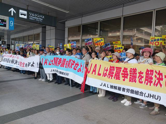 御巣鷹の事故から40年。JHU(JAL被解雇者労働組合)が呼びかけ、「あの日を忘れない。モノ言える職場こそ安全の基盤」とスタンディングアピール。(8月11日・羽田空港第1ターミナル)