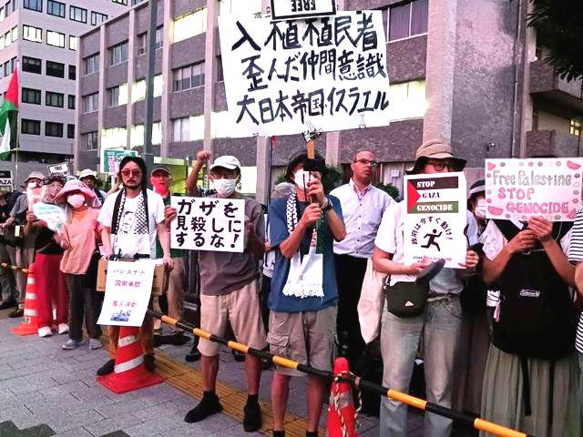超党派人道外交議員連盟事務局長の阿部知子衆院議員(立憲民主党)は「岩屋外相に宛てた『パレスチナ国家承認を求める要望書』に191人の議員が賛同」と伝えるメッセージを寄せた。参加者の一人は「パレスチナ国家をつくるのはパレスチナ人。私たちがしないといけないのは、パレスチナ人が自分たちの手で自己決定できないようしている私たちの足をどけることだ」とスピーチ。9月4日ホテルニューオータニでイスラエルの戦争犯罪人多数を招いて開かれる「サイバーテック東京2025」への抗議も呼びかけられた。