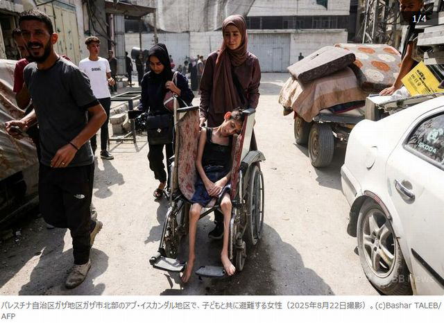 ガザ保健当局によれば、餓死者は子ども121人を含む322人(8/29)。日々増えている。国連安全保障理事会15か国中、米国を除く14か国は「ガザの飢饉は人災」と共同声明を発した(8/27)。イスラエルに対し、支援物資搬入制限を即時解除すること、ガザ市制圧の軍事作戦を撤回することを求めた。だが、イスラエル軍は「ガザ地区南部に移動すれば人道支援を受けられる」と「移住」を強要。「飢饉」にあるガザ市の制圧をやめようとしない。