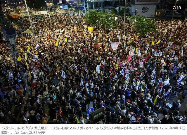 イスラエル国内でも、8月17日、ネタニヤフ政権の戦争継続政策に反対するストライキ、デモが行われた。テルアビブ「人質広場」に50万人。全国100万人以上が参加した。