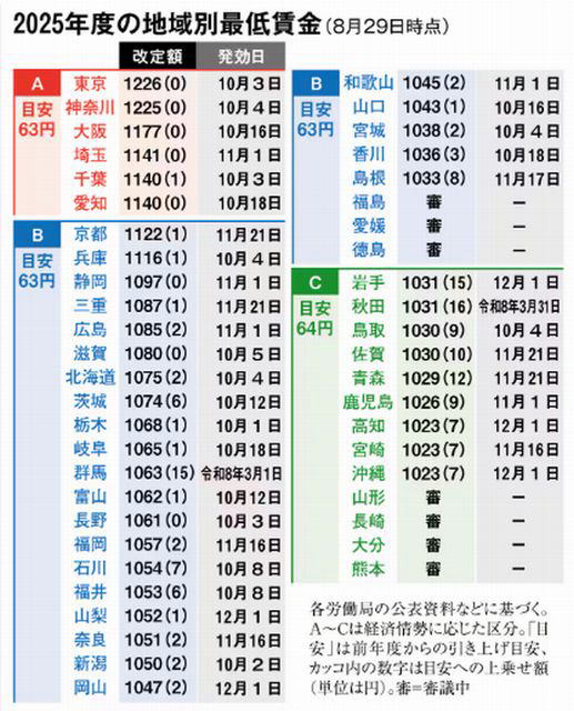8月4日、中央最低賃金審議会は、2025年度の最低賃金について、全国加重平均を63円(6・0%)引き上げる目安を厚生労働大臣に答申した。最も引き上げの目安が高いAランクとそれに次ぐBランクを63円、Cランクを64円とし、下位ランクの目安額を高位よりも引き上げた。これは現行の最賃制度で初めてだ。