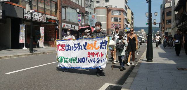 8月16日の「武器はいらない!めしだ!デモ」は、のべ10人ほどの外国人観光客や若者たちが飛び入り参加してくれ、活気あるデモになりました。マヘル・ザインさんの『フリーパレスタイン』の歌が絶大な効果を発揮しました。
