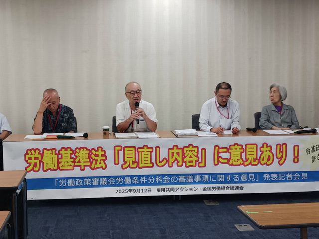 「雇用共同アクション」は9月12日、厚労省内で記者会見し、「労使自治の名のもと、法定基準を下回る働かせ方を広範に容認することは労基法の解体でしかなく、認められない」とする意見を8月末、厚労相と労政審委員らに提出したことを明らかにした。