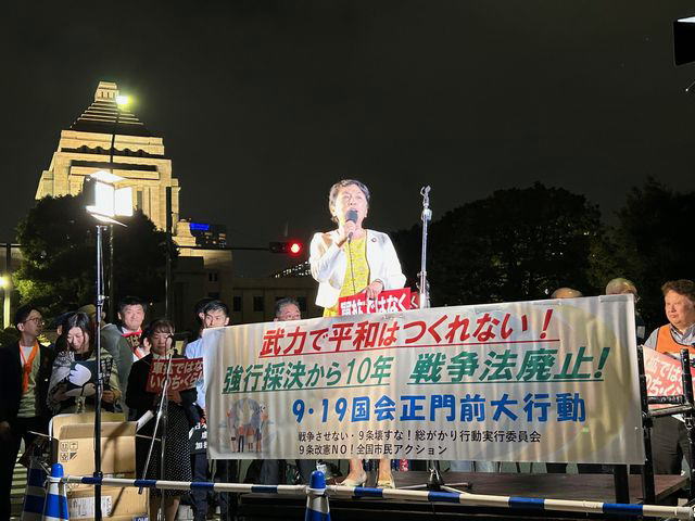 安全保障関連法(戦争法)の強行採決から10年となる9月19日、総がかり行動実行委員会は「武力で平和はつくれない!戦争法廃止!国会正門前大行動」を行った。「軍事費拡大絶対反対」「軍事費よりもくらしにまわせ」「武器の輸出は憲法違反」と2300人が声を上げた。
