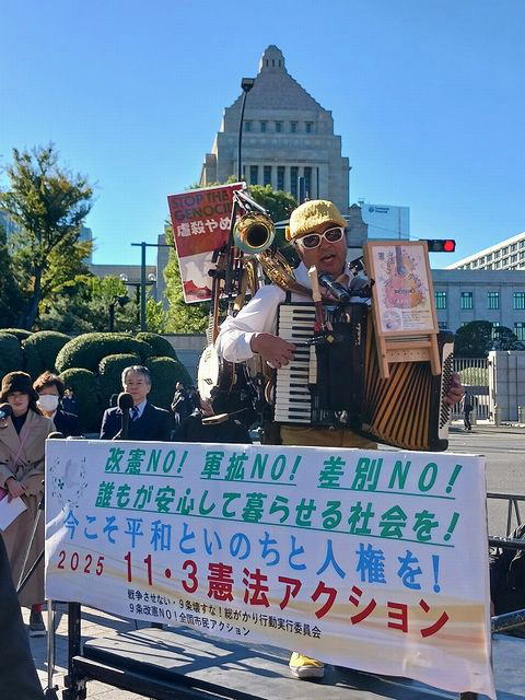 憲法公布から79年の11月3日、国会正門前で「改憲NO!軍拡NO!差別NO!憲法アクション」が行われ、2300人が集った。