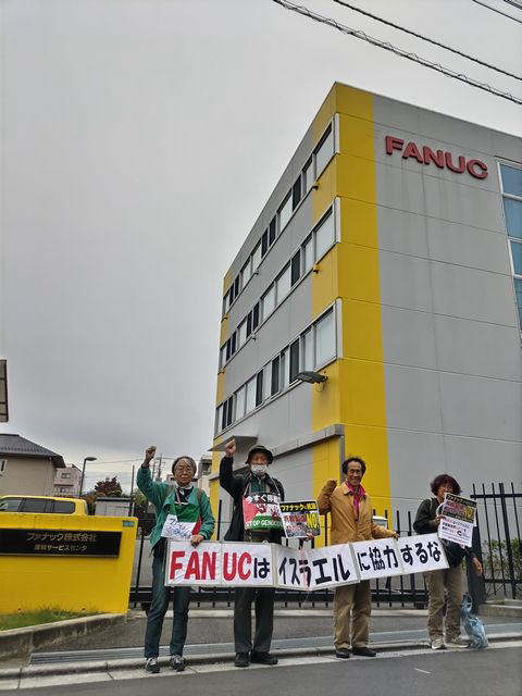 私たちは「ファナックはイスラエルに協力するな」と看板を広げ、入口からマイクで「訪問予定をお伝えしていたZENKOです。