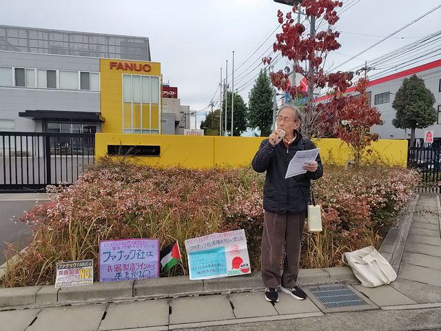 一人ひとりが「ファナックは人殺しのロボットを作るな」のプラカードを持って、「虐殺やめろ」のバナーを広げ、マイクアピールとコールを行いました。