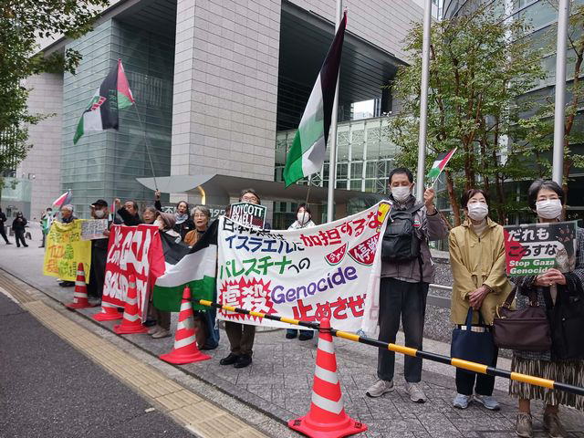 ZENKOの山川よしやすさんは「パレスチナの人を殺すような武器製造ラインにファナック社製品を売るな」と訴えた。連帯行動に駆けつけた「Free