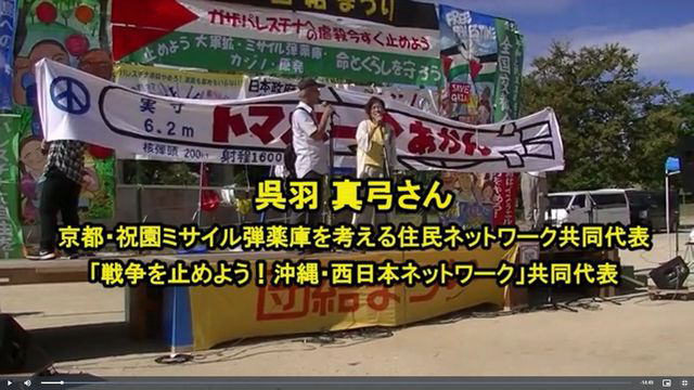 11月1日配信は、10・13団結まつり(大阪)での「京都・祝園ミサイル弾薬庫問題を考える住民ネットワーク」の呉羽真弓さん(「戦争止めよう!沖縄・西日本ネットワーク」共同代表)と神田たかひろさん(京都府精華町議)による祝園弾薬庫反対の取り組みと訴えを伝える。長射程ミサイルをイメージした9mもの横断幕が登場。まともな住民説明会もないまま、中国に届く巨大ミサイルが精華町の住宅地そばの弾薬庫に持ち込まれる危険性を報告した。
