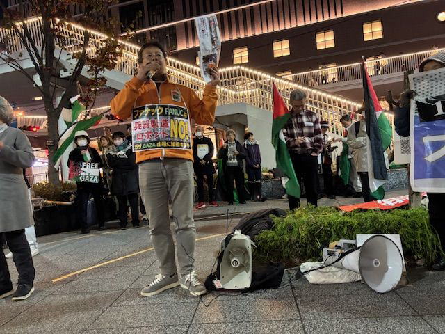 ZENKOの山川よしやすさんは「パレスチナから労働者闘争ユニオン委員長モハマド・アローシュさんが来日し連帯。集会時に彼の息子がズームで『子どもが何人死んだと言われるが、数字ではない。僕はゼイン、名前がある』と。殺された人たちにもっともっと思いを馳せなければ。11月5日、ファナック社全国13事業所に要請行動した。さらに追及したい。協力企業に電話1本かけるだけで大きな力になる。一緒に声を上げよう。殺すな!」と訴えた。