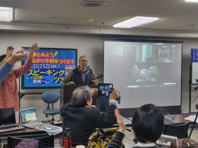 4日兵庫集会は、奄美の自然と平和を守る郡民会議・富純一さんが鹿児島県徳之島の軍事訓練を報告した。