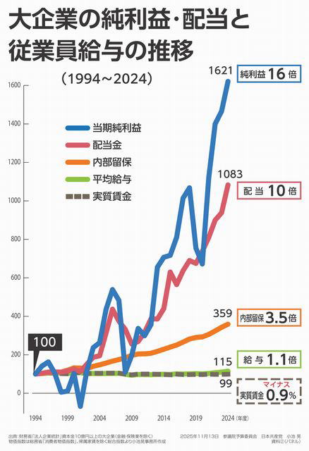90年代半ばから30年にわたる賃金の低迷は、強欲なグローバル資本による労働者の搾取が強められてきたことによる。大企業では24年度の経常利益から税金等を引いた純利益は1994年度の16倍になった。株主配当も10倍に増やした。一方、従業員の給与は1・1倍にすぎず、実質賃金はマイナス0・9%だ(図)。