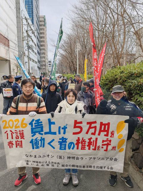 今回の集会とデモは、「行動無くして成果無し」(西山共同代表)を心に刻み、職場と地域へより一層踏み出し、神明会理事長に雇止め撤回を求め不払い残業代訴訟勝利へ前進していくステップになりました。ともに闘いましょう!