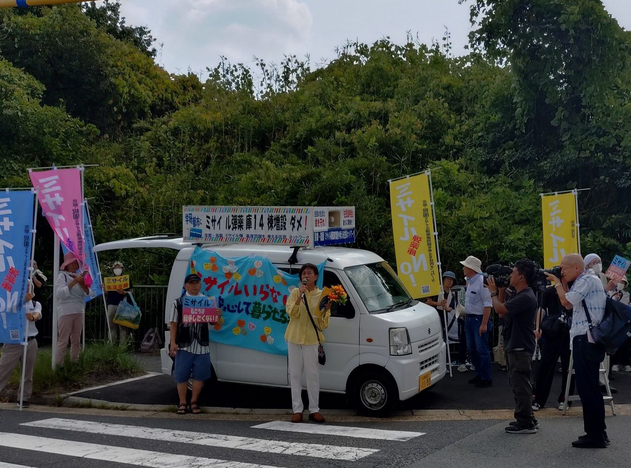 弾薬庫増設工事強行に抗議する市民。「私たちは二度と戦争をしたくない!平和でこそ文化は香り立つ!全国集会」の準備も進む(4・5面に関連記事)。